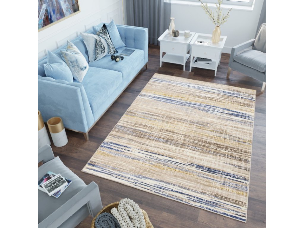 Bílo-hnědý koberec Pat se vyznačuje svými modrými páskovými prvky. Polypropylenová vlákna ze kterých je koberec vyroben, jsou vynikající měkká a pružná. Koberec se nedeformuje, je odolný vůči oděru a snadno se čistí. Design tohoto koberce je předurčen do dětského nebo obývacího pokoje. Skvěle doplní jak moderní, tak klasický interiér.