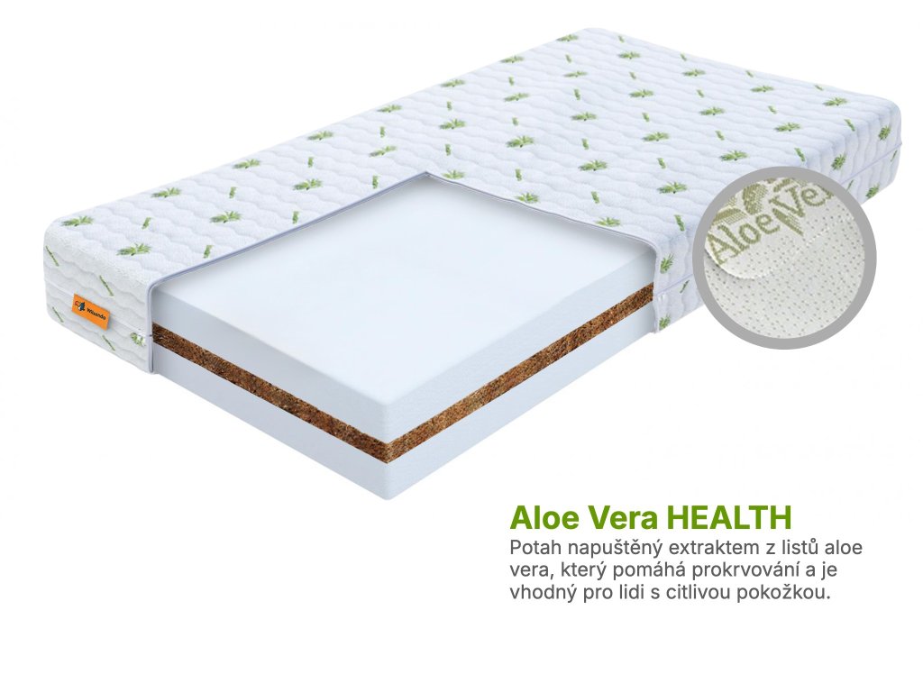 Materiálové složení: 2,5 a 2,5 cm Polyuretanová pěna T25, 1 cm Kokosová vrstva, Potah Aloe Vera