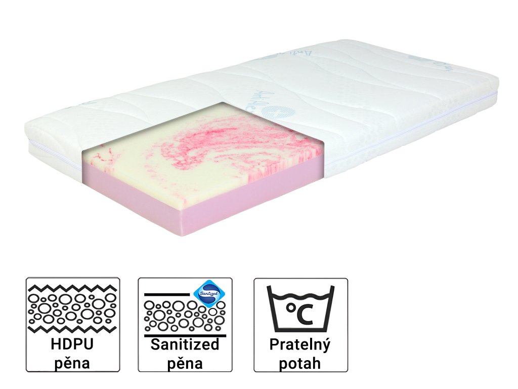Antibakteriální PUR pěna s úpravou SANITIZED, která chrání před houbami a plísněmi. Navíc dokáže ochránit pěnu i před nepříjemným zápachem způsobeným těmito organismy. Ochrana SANITIZED zaručí delší životnost matrace a zdravější prostředí pro spánek.