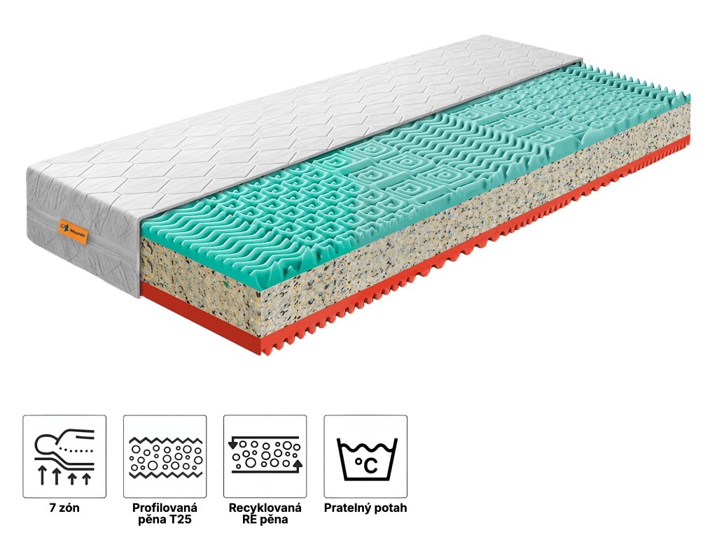Profilovaná 7-zónová vysoce kvalitní pěna zajišťuje zlepšení prokrvení pokožky a uvolnění svalstva během spánku. Vlivem teploty těla se přizpůsobuje jeho tvaru, čímž zvyšuje pocit dobrého spánku. Díky systému 7 zón tvrdosti nabízí páteři i celému tělu přirozenou polohu a podporu. Tato pěna je vhodná i pro alergiky.