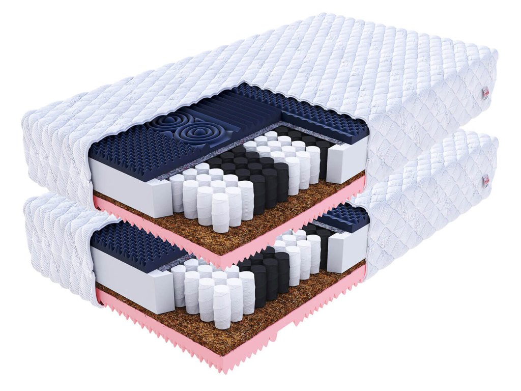 Stranu 1 tvoří paměťová pěna VISCO reagující na teplo a tlak vašeho těla, díky čemuž vám umožní měkce se zabořit do matrace a užít si příjemný spánek na boku bez pocitu tlaku na klouby. Kokosová deska umístěná pod paměťovou pěnou přitom zajistí i vysokou pevnost. Stranu 2 tvoří profilovaná HR pěna, která klade 2x větší odpor po zatížení lidským tělem a poskytuje pevnost a oporu každému, kdo se trápí s problémy páteře nebo prostě jen upřednostňuje tvrdší lůžko při spánku. Matracové vrstvy jsou spojeny speciální ekologickou a bezzápachovou technologií lepení bez obsahu rozpouštědel, škodlivých látek a výparů. Masážne matrace mají antialergický potah Premium Jersey 3D, který lze prát v pračce.