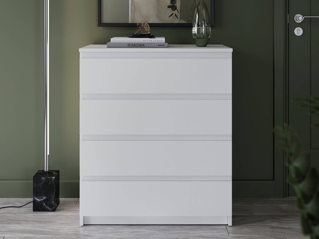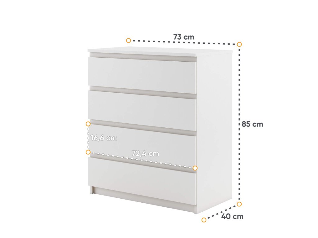 Bílá komoda IDEA se čtyřmi prostornými zásuvkami, do kterých si můžete uložit vše od ponožek, přes trička až po psací potřeby. Kromě zásuvek můžete využívat samozřejmě i vrchní desku, kde budete mít prostor ať už na dekorace, nebo košíky s doplňky. Bílá komoda je vyrobena z kvalitní laminované desky. Hrany jsou zakončeny odolnou ABS dýhou.