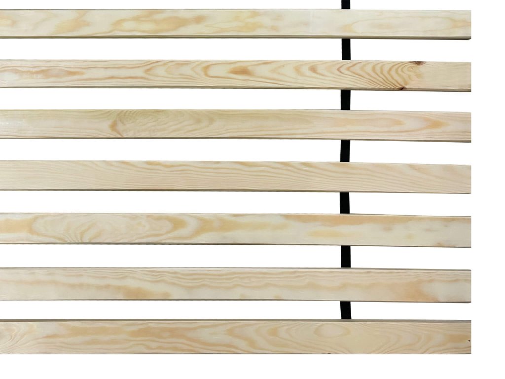 Laťkový rošt do postele v rozměrech 90x200 cm je vyroben z nelakovaného borovicového masivního dřeva. Dřevo je hladce opracované a je spojeno popruhem, který může být bílé nebo černé barvy. Rošt je složen z 24 latí a je vhodný pod pružinové, taštičkové a pěnové matrace s hrubou pěnou. Rošt zajistí rovnoměrnou pevnou plochu a přispívá k odvětrání matrace.