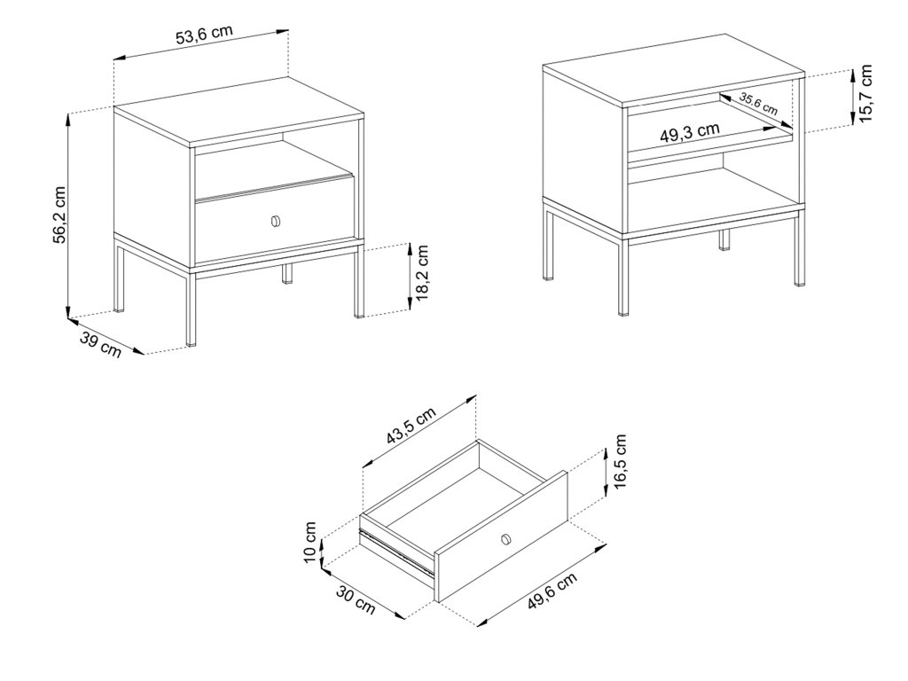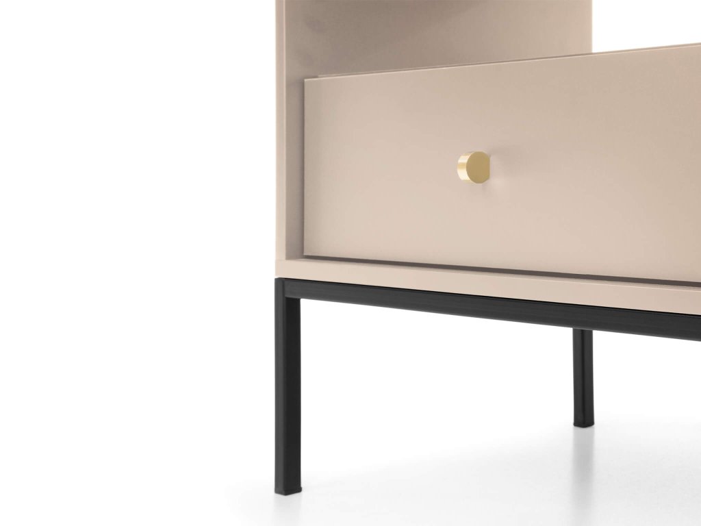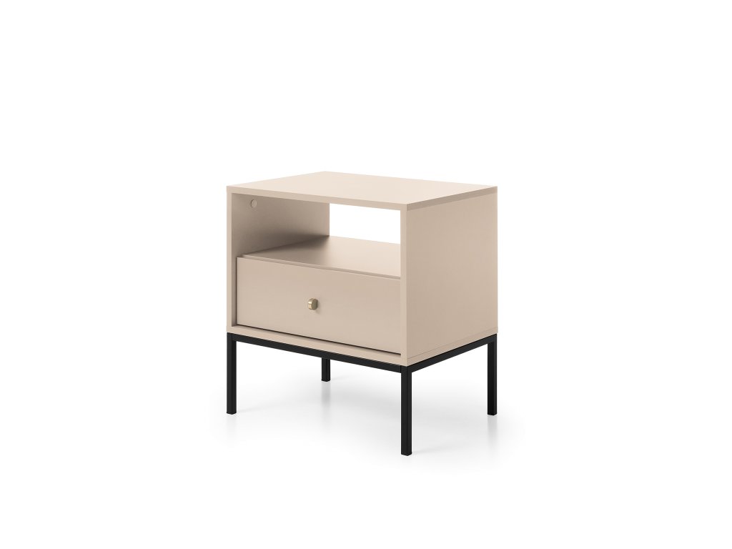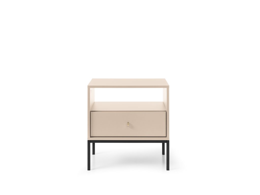 Noční stolek Bono 54 je vyroben z kvalitní DTD desky tloušťky 16 mm, chráněné ABS páskou pro prodloužení životnosti. Horní deska je z certifikované DTD desky s tloušťkou 16 mm a je také chráněna proti mechanickému poškození ABS páskou, což zaručuje vysokou trvanlivost a odolnost vůči mechanickému poškození. Stolek má otevřenou polici na odložení drobností a praktickou zásuvku. Elegantní zlatý kovový úchyt a kovové černé nohy doplňují minimalistický design.