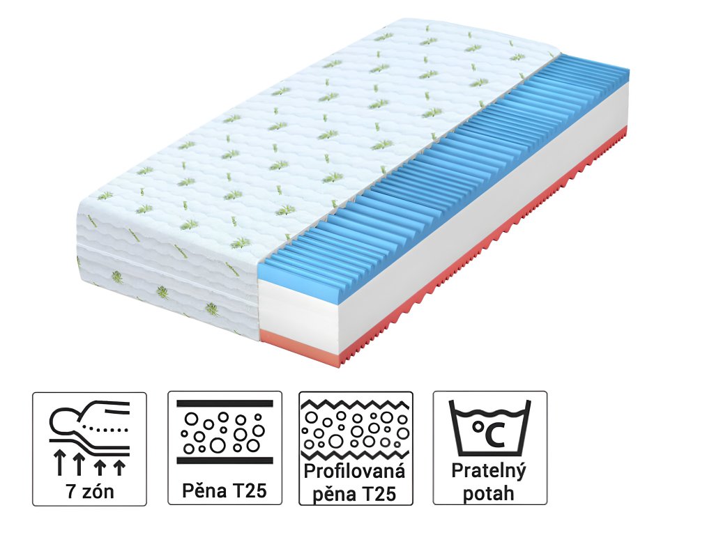 Profilovaná 7-zónová vysoce kvalitní pěna zajišťuje zlepšení prokrvení pokožky a uvolnění svalstva během spánku. Vlivem teploty těla se přizpůsobuje jeho tvaru, čímž zvyšuje pocit dobrého spánku. Díky systému 7 zón tvrdosti nabízí páteři i celému tělu přirozenou polohu a podporu. Tato pěna je vhodná i pro alergiky.