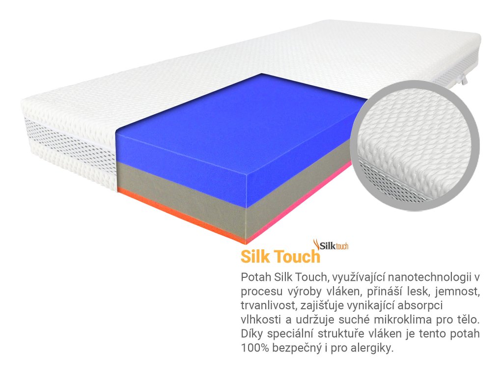 Naše odhodlání k dokonalosti je zapečetěno s exkluzivním potahem Silk Touch s 3D mřížkou na větrání. Tento potah je nesrovnatelně jemný, ale zároveň trvanlivý, dokáže absorbovat a odstraňovat vlhkost a je ideální pro alergiky. S antibakteriálními vlastnostmi a možností praní v pračce při 60 stupních nabízí tento potah vždy čisté a zdravé spánkové prostředí. Je navržen pro nosnost až 180 kg a dostupný ve více rozměrech, aby si každý z vás vybral ten pravý.