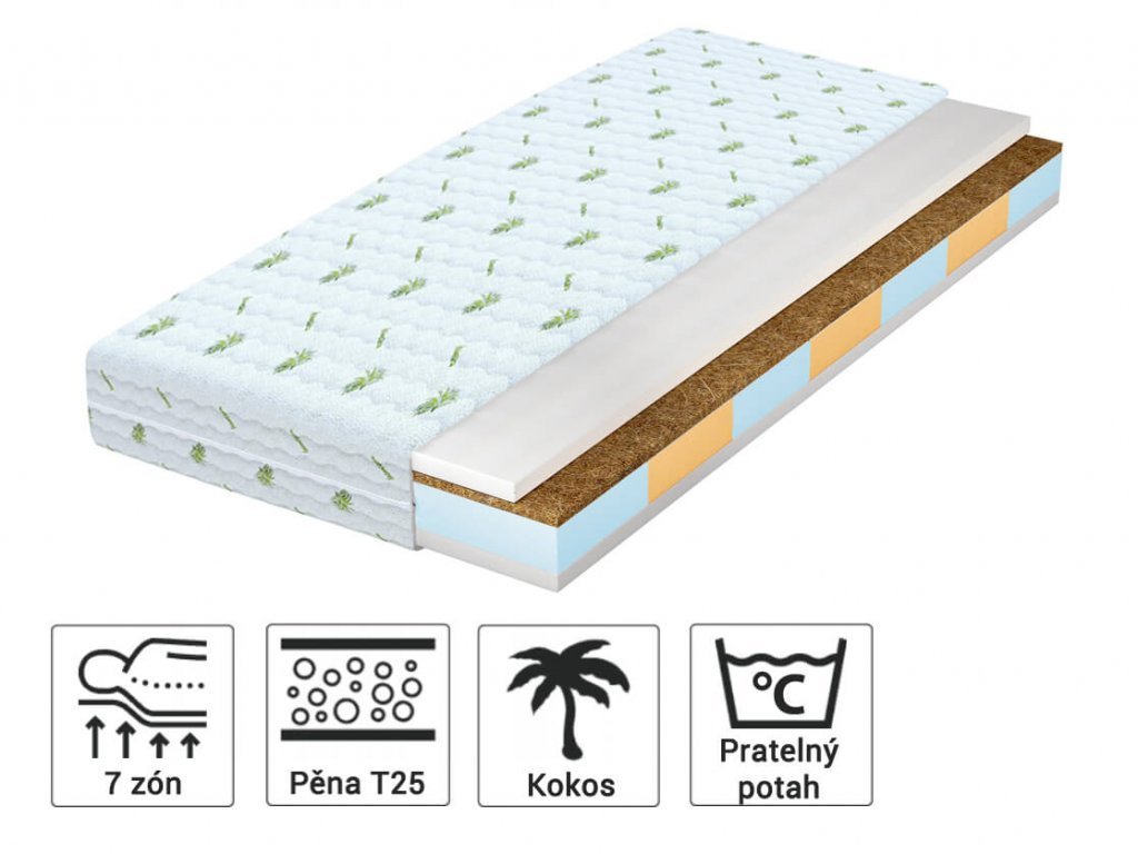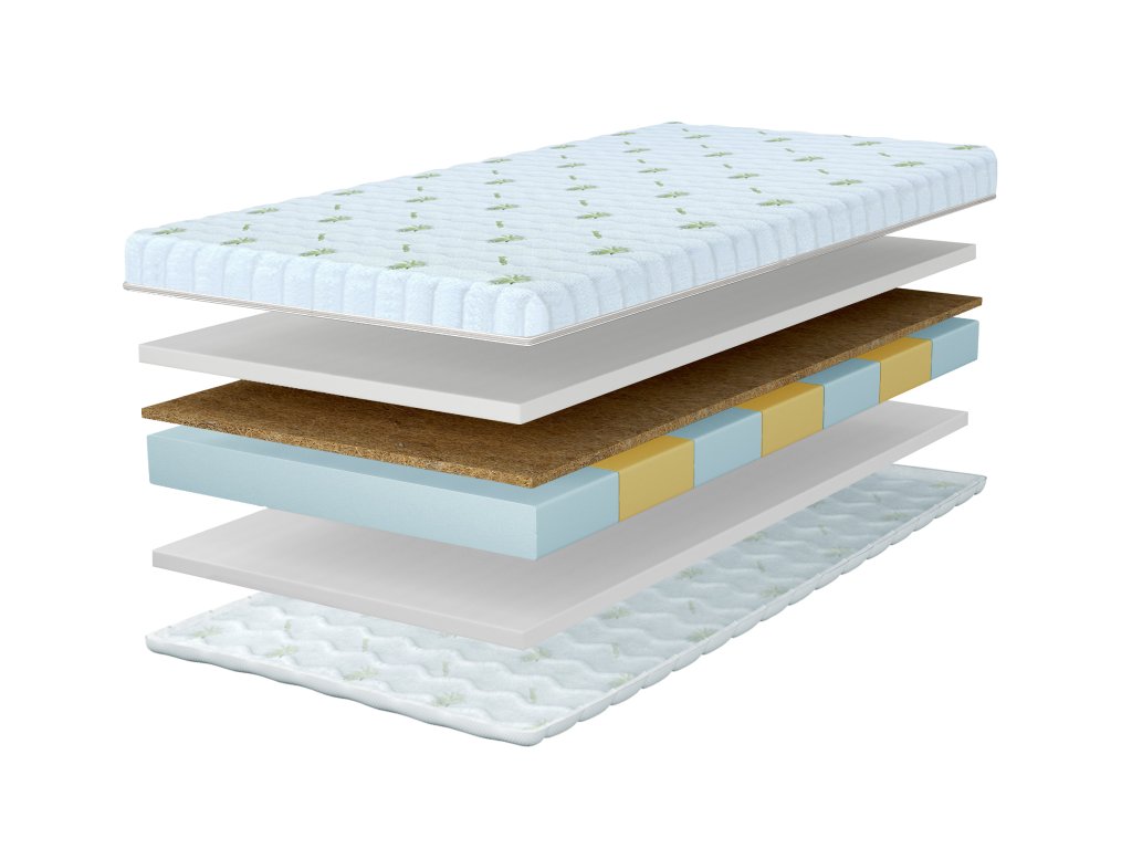 Základním materiálem této matrace je polyuretanová pěna, která poskytuje výjimečnou trvanlivost a pohodlí. Sedmizónový design této pěny zajišťuje optimální uvolnění svalstva během spánku. Kromě toho je tato matrace obohacena o 100% přírodní kokosové vlákno, které zvyšuje pevnost a pružnost matrace. Kokosová vrstva také pohlcuje vlhkost a zabraňuje vzniku roztočů, čímž se prodlužuje životnost a obecná hygiena matrace. Aby toho nebylo málo, tak tato vrstva přidává i další stranu tvrdosti. To znamená, že matraci můžete používat na měkčí nebo tvrdší straně, podle svých osobních preferencí. Matrace má také antialergické vlastnosti, což ji činí vhodnou pro alergiky.