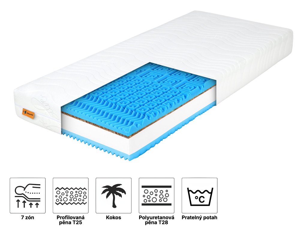Materiálové složení: Polyuretanová pěna T28, Profilovaná polyuretanová pěna T25, Kokosová vrstva, Potah Silver Care