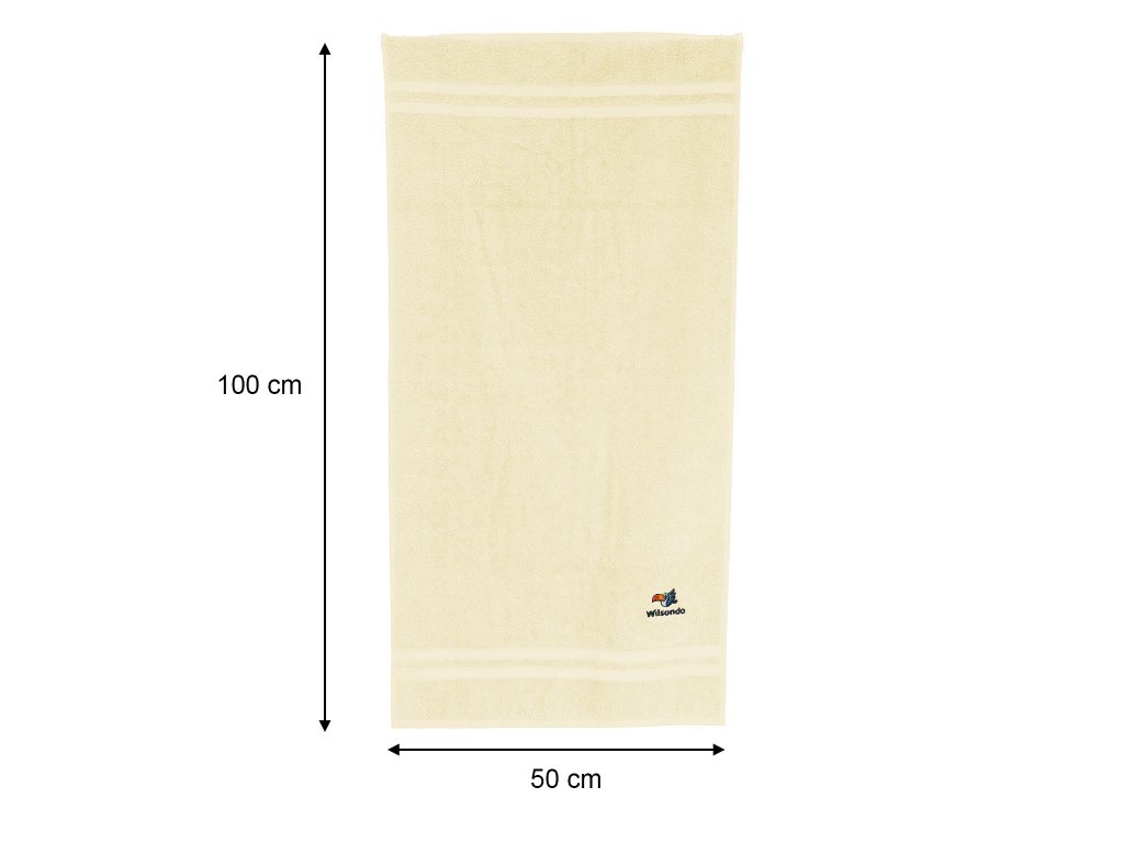 Krémový ručník Wilsondo s rozměrem 50×100 cm je ideální do koupelny, na sport i na cesty. Je vyrobený ze 100 % froté bavlny s gramáží 400 g/m², takže spolehlivě absorbuje vlhkost a zároveň zůstává jemný na dotek. Zesílená dvojitá smyčka zajišťuje pevnost a dlouhou životnost i po mnoha praních. Elegantní krémová barva vnáší do každého prostoru jemnost a čistotu, která nikdy nevyjde z módy.