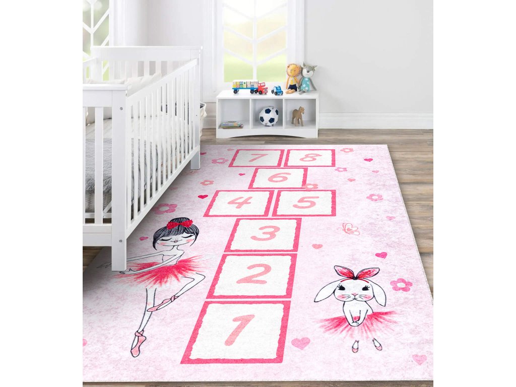 Dětský pokoj vaší dcery by měl obsahovat také koberec, který poskytne větší bezpečí při hraní či lození. Dětský koberec Balerína je v roztomilé růžové barvě, která potěší každou slečnu. Na koberci se nachází dětská hra. "školka" spolu s balerínou a zajíčkem. Koberec je vyroben ze 100% polyesteru, který je šetrný k dětem i alergikům. Krátký vlas na koberci zajistí, že žádná hračka či kostka se v něm neztratí. Koberec Balerína má protiskluzové dno, které zabraňuje jeho posunu po podlaze. V případě zašpinění koberce je možné prát jej v pračce při teplotě 30°C. Tento typ koberce lze použít i při podlahovém topení.