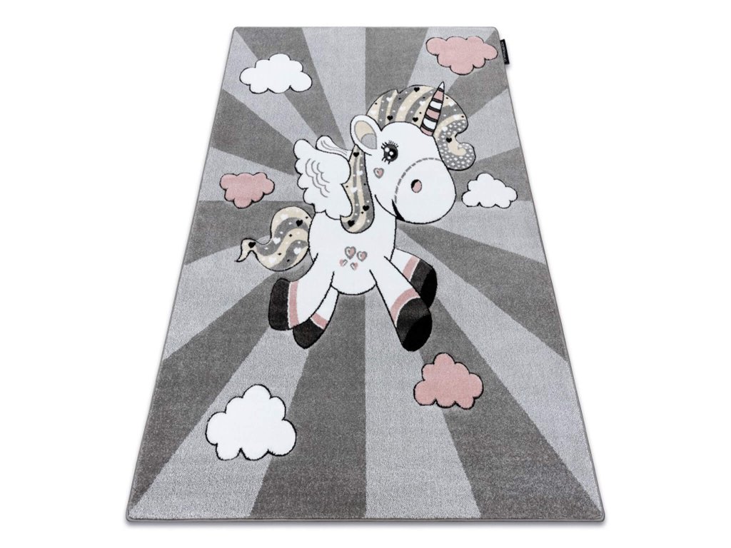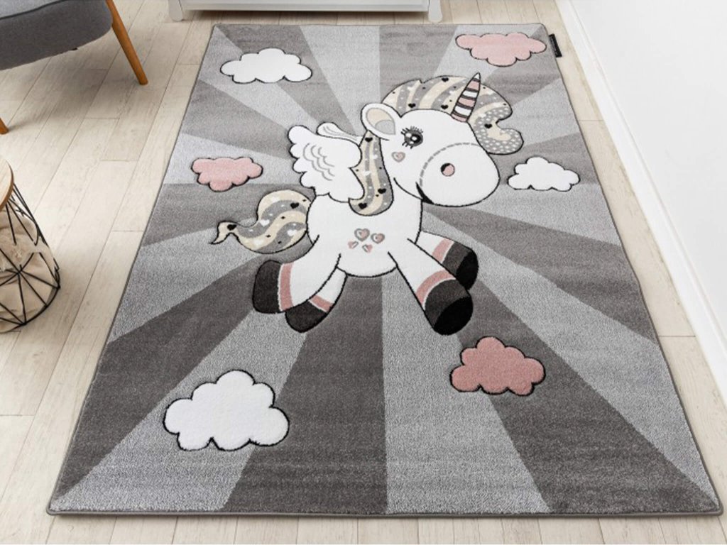 Koberec Unicorn přidává do dětského pokoje útulný a příjemný vzhled. Děti mohou sedět nebo ležet na koberci při hraní, čtení nebo sledování televize. Jedná se o pohodlný povrch, který je příjemný na dotek. Barevné provedení koberce a jeho design je primárně určen pro dívky. Šedý dětský koberec Unicorn má hustotu štětin až 2500g/m2 a výšku vlasu 13 mm. Vlákno ze kterého je koberec vyroben je polypropylenové (PP) a má vynikající měkkost a pružnost díky svému tepelnému zpracování. Nedeformuje se a vyznačuje se odolností proti oděru. Co jistě oceníte je snadná údržba a středně dlouhý vlas. Je k dispozici ve více rozměrech.