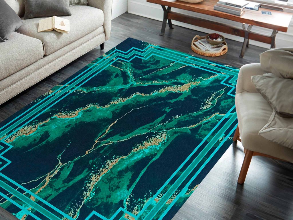 Jedinečný koberec Horama ve smaragdové barvě s mramorovým dekorem, vyrobená ze 100% polypropylenu. Koberce jsou skvělou volbou do jakéhokoli interiéru. Kombinace barev jim dodává neobvyklý charakter. Koberce jsou zakončeny tenkými třásněmi. Díky měkkým a flexibilním materiálům je extrémně lehký. Ve výrobním procesu nebyla použita žádná toxická ani znečišťující barviva. Je tak ekologický a šetrný k životnímu prostředí.