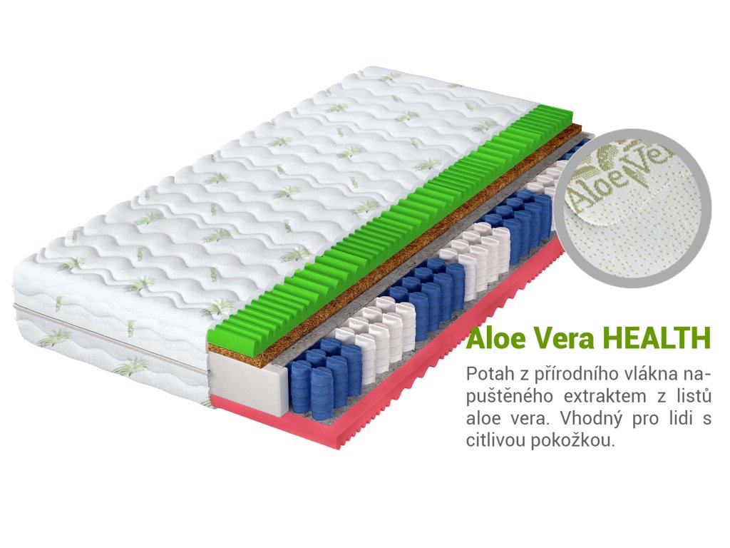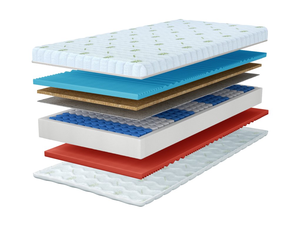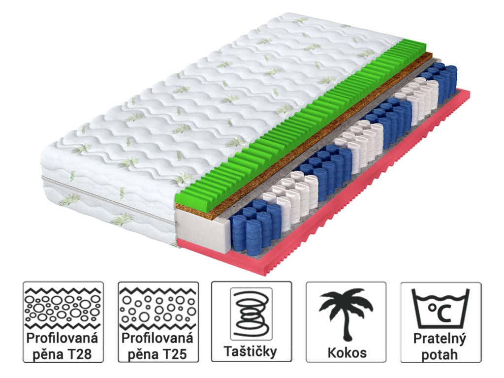Materiálové složení: Filc, NanoHARD taštičkové pružiny, Kokosová vrstva, Polyuretanová PUR pěna T25 a T28, Potah