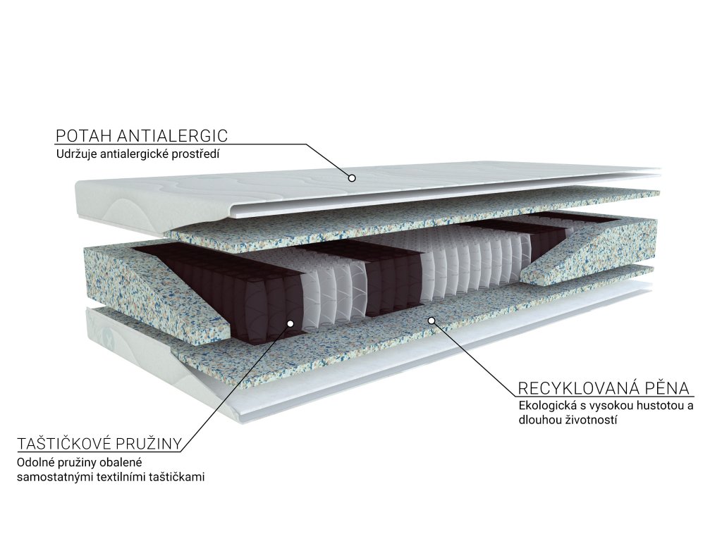 Materiálové složení: Taštičkové pružiny, ECO pěna, odnímatelný antialergický potah prošitý s PES vláknem s hustotou 200 g/m2