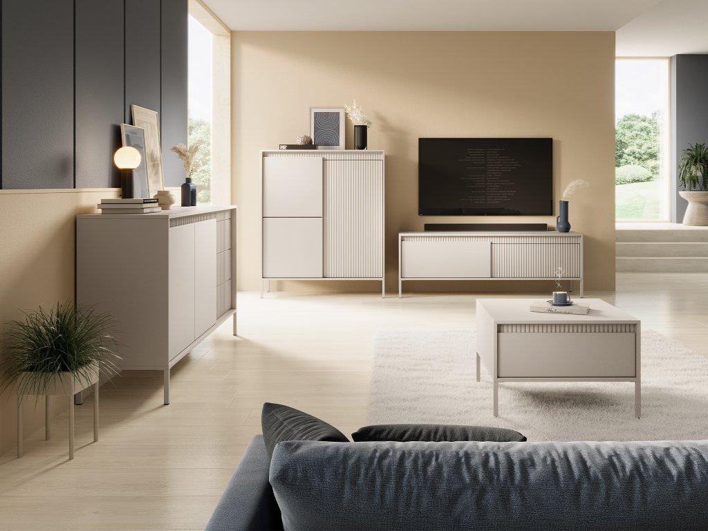 Jemná a zároveň velmi moderní kolekce SENSO je určena do každého obývacího pokoje. Kolekce se vyznačuje svým 3D vroubkovaným efektem na přední straně nábytku. Kolekce SENSO stojí na vysokých kovových nožičkách a je v jemné béžové barvě. Béžový odstín je jasnou stálicí na trhu a určitě s ním u vás doma nic nezkazíte. Jednotlivé kusy nábytku mají zabudovaný systém "push to open", který umožňuje otevřít jednotlivé skříňky a poličky pomocí jemného dotyku na rozích dvířek. Kusy z kolekce SENSO mohou být součástí i jiných místností vaší domácnosti jako je např. předsíň či pracovna. Konstrukci nábytku tvoří laminovaná MDF deska, drážkovaná čela a ABS hrany, které zaručují stabilitu a vyšší odolnost.
