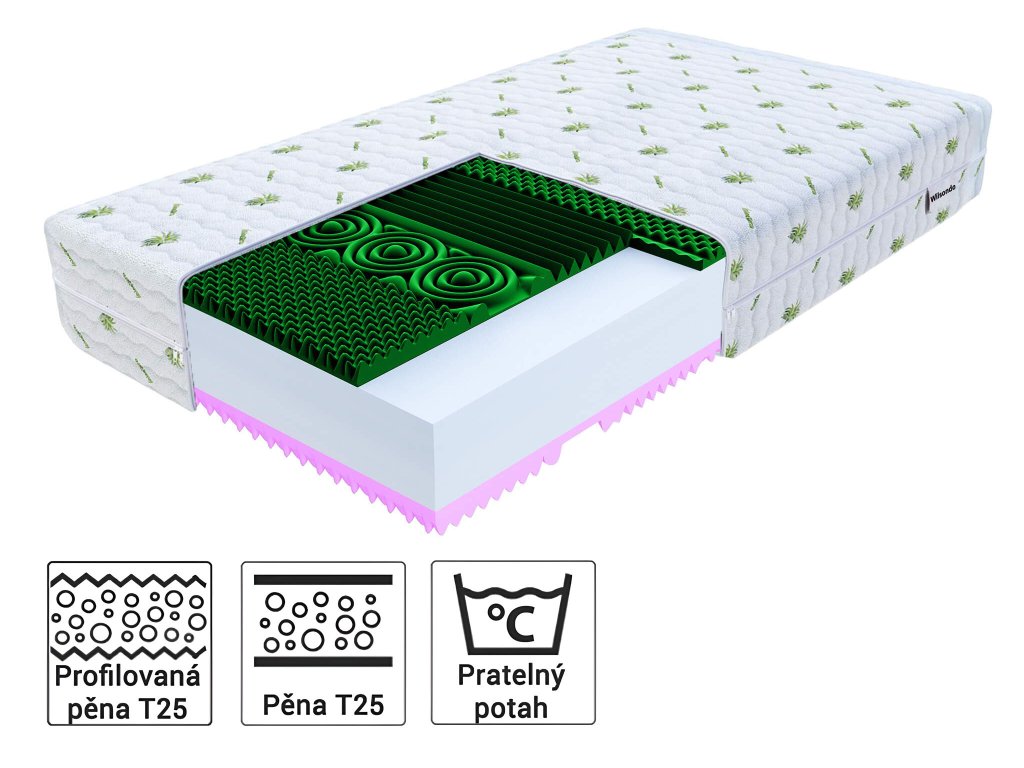 Profilovaná 7-zónová vysoce kvalitní pěna zajišťuje zlepšení prokrvení pokožky a uvolnění svalstva během spánku. Vlivem teploty těla se přizpůsobuje jeho tvaru, čímž zvyšuje pocit dobrého spánku. Díky systému 7 zón tvrdosti nabízí páteři i celému tělu přirozenou polohu a podporu. Tato pěna je vhodná i pro alergiky.