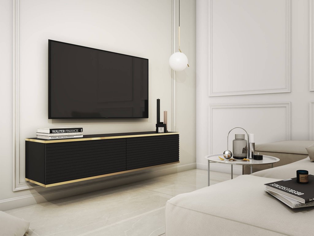 TV stolek Oro představuje moderní kus nábytku, který kombinuje funkčnost s elegancí. Jeho černá barva dodává prostoru sofistikovaný vzhled, zatímco šířka 135 cm poskytuje dostatek místa pro vaši televizní sestavu a další zařízení. Tělo stolku je vyrobeno z laminované dřevotřísky a je ohraničeno ABS hranami, což zaručuje trvanlivost a odolnost vůči poškození. Stolek disponuje dvěma výklopnými skříňkami, které mají drážkovaná dvířka z MDF desky. Tento detail přidává nábytku texturu a zajímavý vizuální efekt. Zlaté lemování na hranách stolku dodává jemný akcent a dotváří luxusní dojem. Oro je navržen tak, aby se zavěsil na stěnu, což vytváří iluzi plynulého prostoru a umožňuje snadné úklid pod ním. Jeho systém push-to-open bez úchytek přispívá k čistému a minimalistickému designu, kde stačí jemný stlačovací pohyb k otevření skříněk. Výsledkem je TV stolek, který kombinuje moderní prvky, praktičnost a estetiku. Oro se stane středobodem vašeho obývacího prostoru a přinese do něj dotek elegance a stylu.
